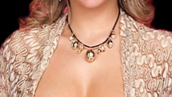 This image presents a dramatic, emotionally charged portrait of a woman against a dark background. She appears carefully styled, with softly layered blonde hair, refined makeup, and elegant jewelry that includes a necklace and earrings. Her clothing has a shimmering, textured quality, suggesting a glamorous or formal aesthetic often associated with studio portraits or promotional photography. The lighting highlights her face and upper body, drawing immediate attention to her expression, which feels calm and composed, almost timeless.